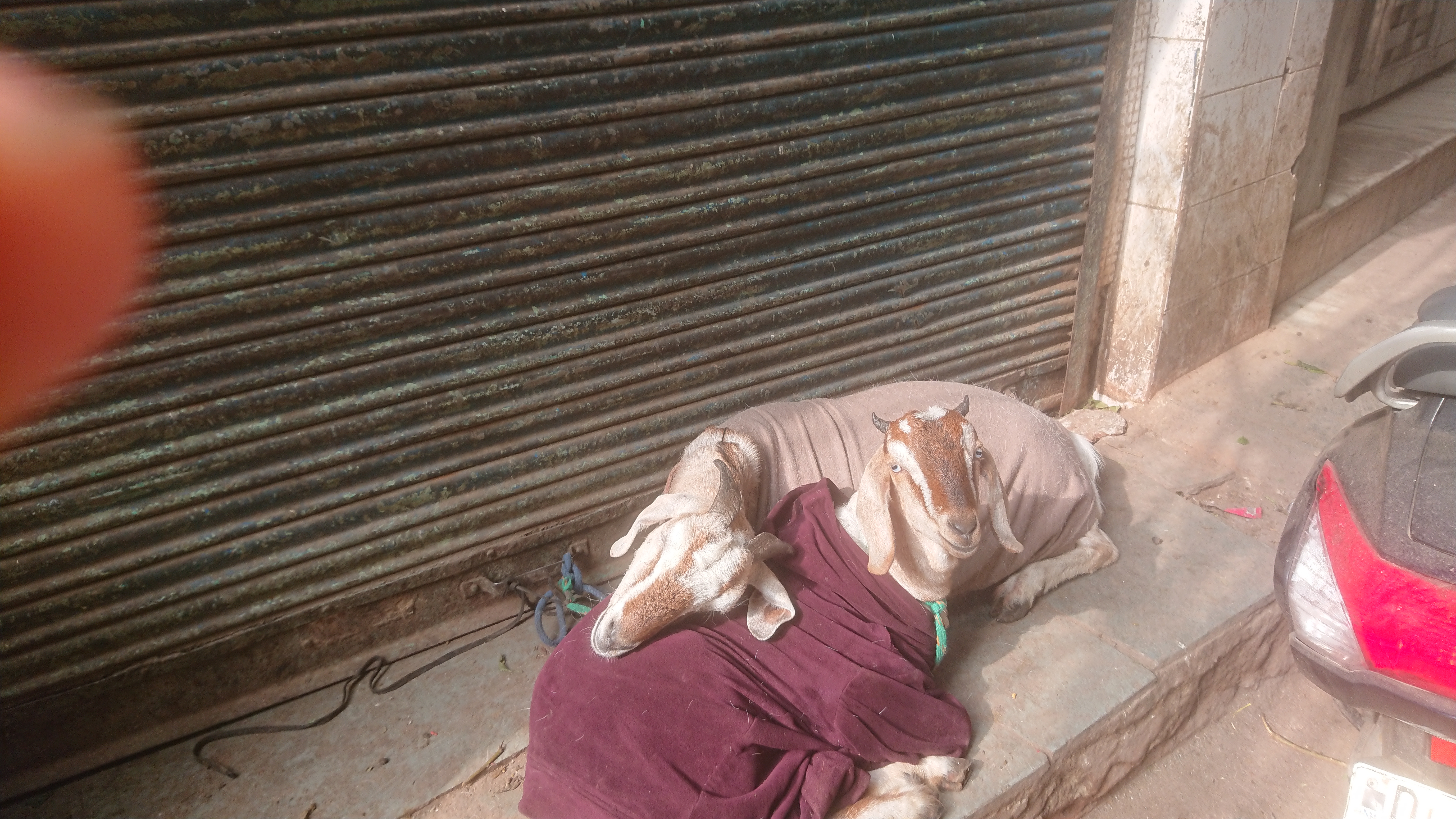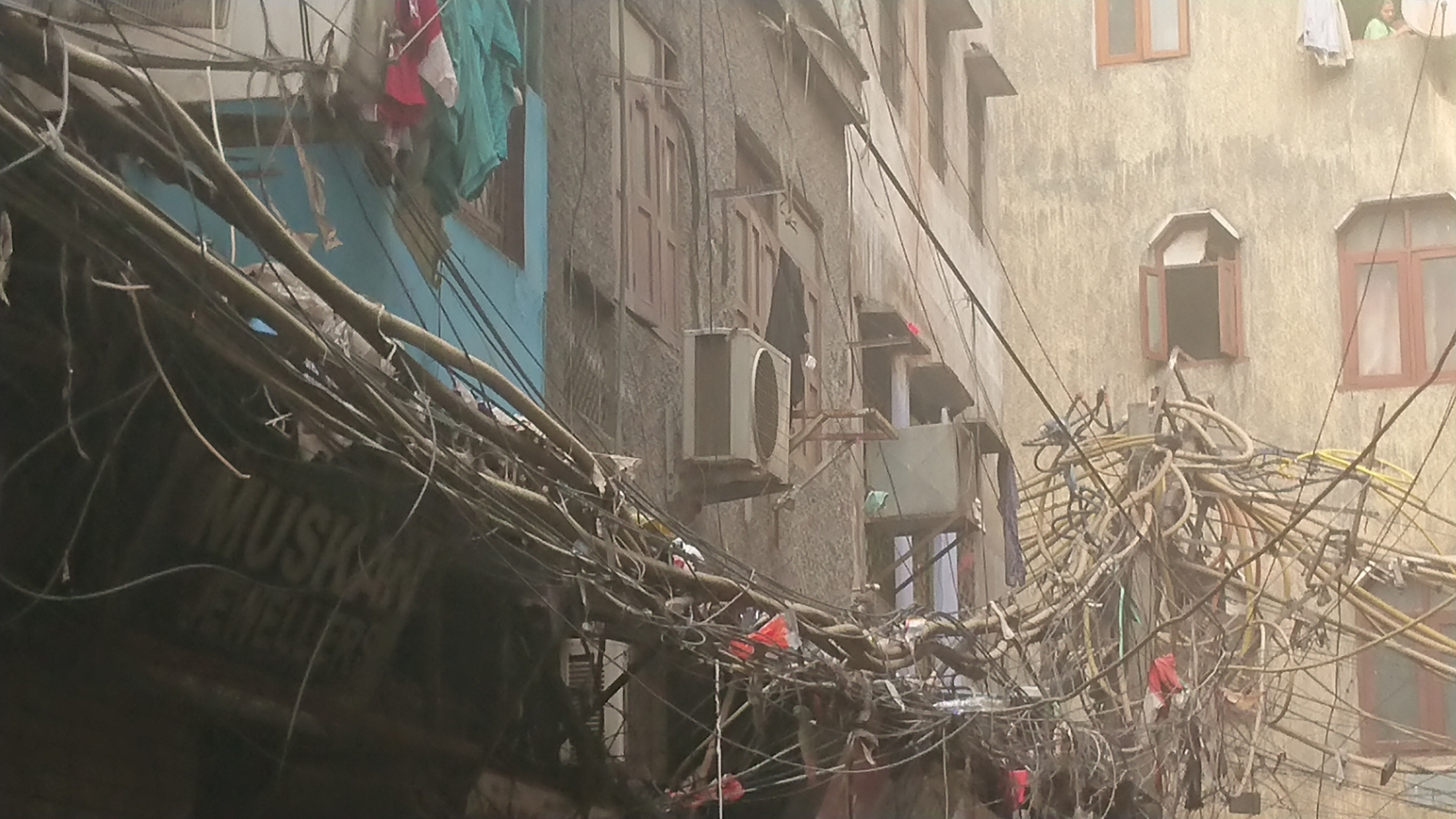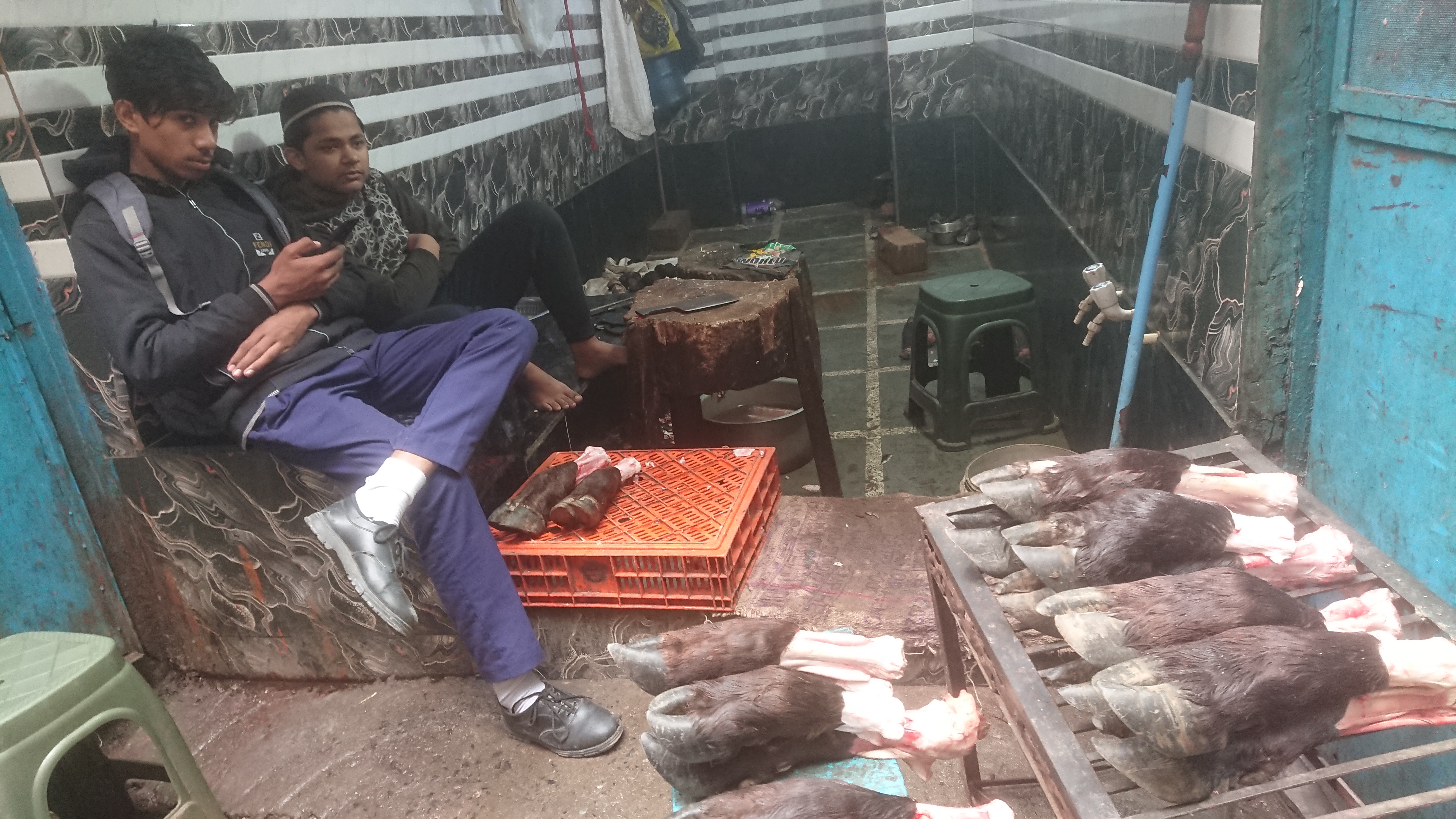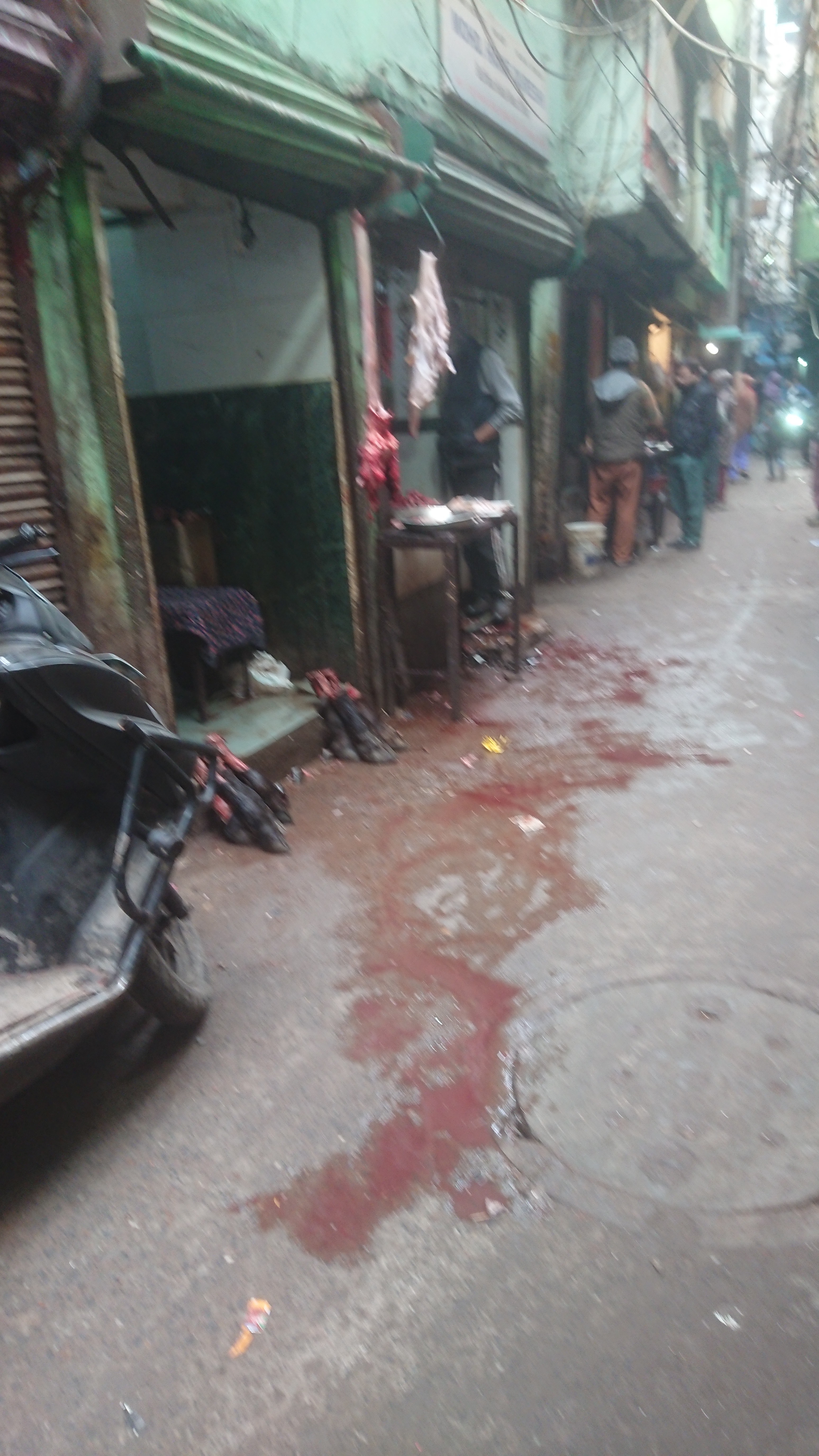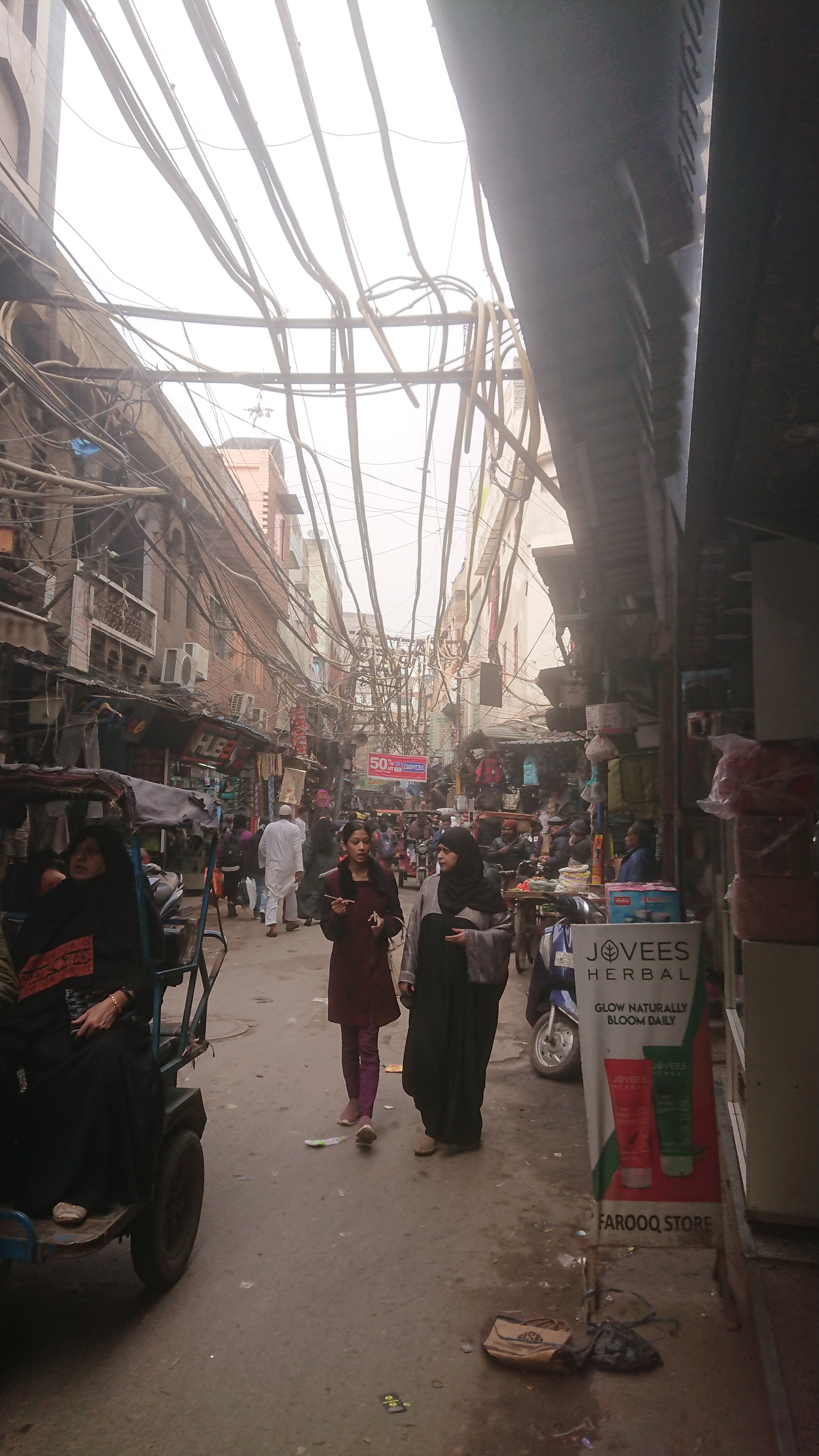 De là, je me suis enfoncé dans des petites ruelles pour rejoindre Jama Masjid[2], la mosquée de Delhi. Outre les hommes aux barbes oranges et les femmes voilées, quelques rares burqas, on reconnaît qu'on est dans un quartier musulman par le nombre de boucheries. Je suis entré par la rue des vendeurs de pieds de vaches, ou peut-être de buffles, utilisés pour préparer un plat traditionnel très populaires chez les musulmans et; bien sûr, pas chez les hindous. . Ils sont empilés artistiquement sur le sol et l'on doit enjamber les flaques du sang de leur découpe. À hauteur du premier étage, sur les murs et suspendus au milieu de la rue, un enchevêtrement de câbles électriques de toutes sortes : un cauchemar pour un employé d'Enedis ou un installateur de fibre optique.