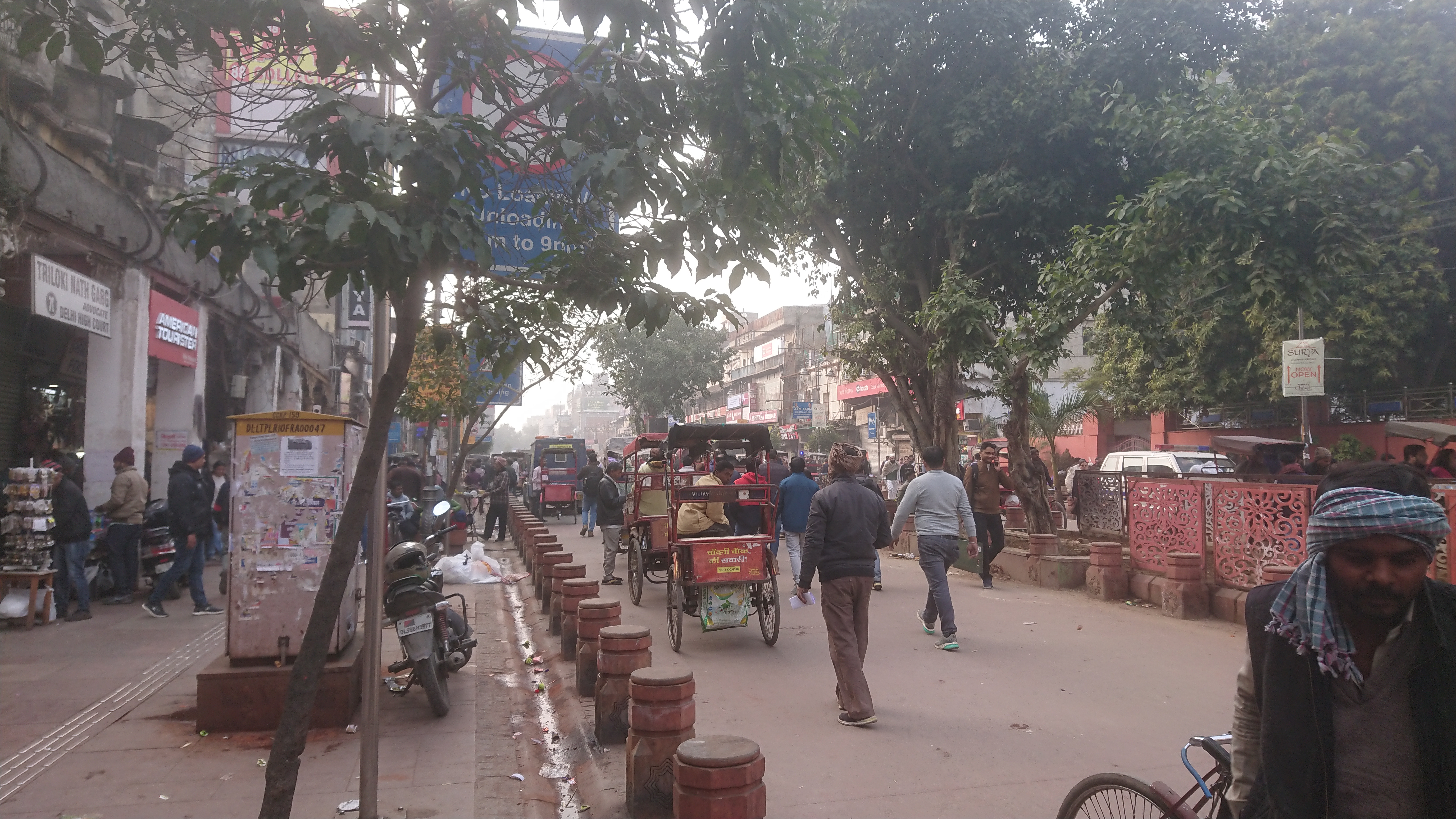 Après rendu ma place, mon chauffeur m'a déposé à l'entrée de Chandni Chowk. Et là, on peut dire que Delhi a changé. Le marché était le lieu de convergence des habitants du vieux Delhi. Aujourd'hui, ils en ont été écarté et il faut s'enfoncer dans les ruelles pour a retrouver. On vient de partout pour faire son marché ou du tourisme. On n'y vend plus tout et n'importe quoi mais du bon chic bon genre : bijoux, soie, épices, etc. L'artère principale est devenue piétonne avec, au milieu, deux voies réservées aux cyclopousses. C'est propre, il y a même des balayeurs... on se croirait chez Anne Hidalgo.